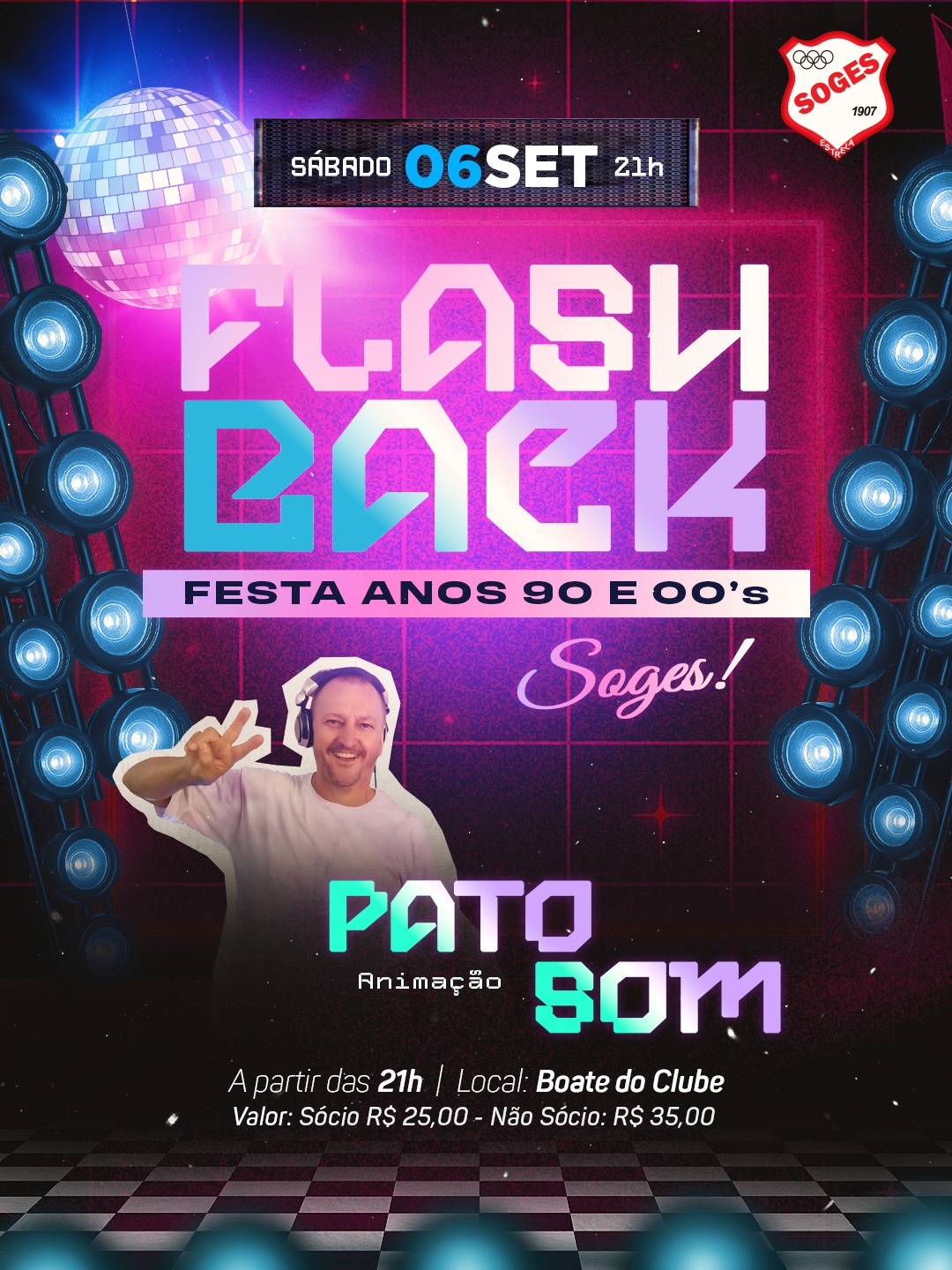 No sábado, 06 de setembro, a partir das 21h, a SOGES vai te levar de volta no tempo com a Festa Flashback – Anos 90 e 00’s. A animação da noite fica por conta do Pato Bom, trazendo muita música, diversão e nostalgia na Boate do Clube. Valores antecipados: Sócio: R$ 25,00 Não sócio: R$ […]