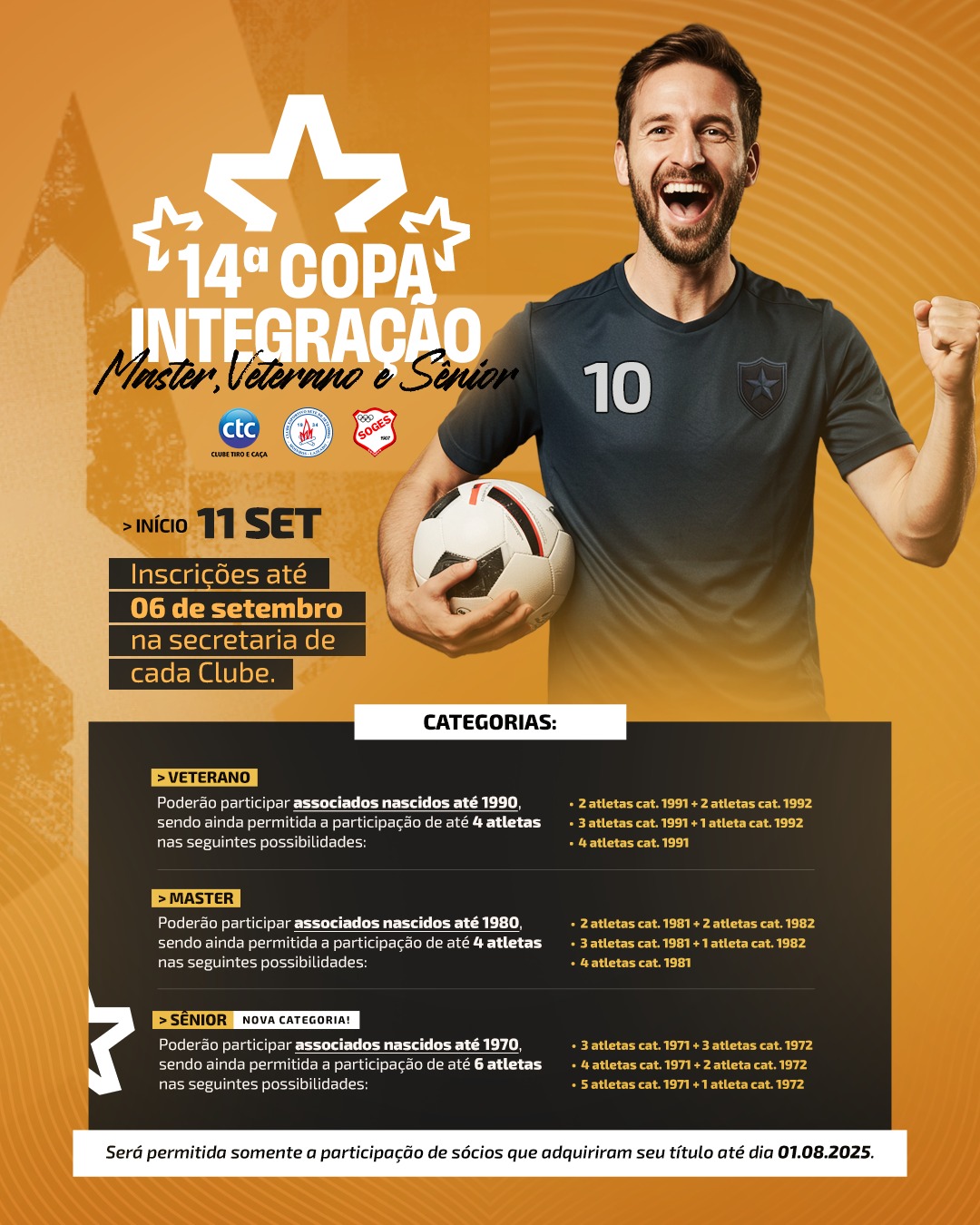 A tradicional Copa Integração entre os clubes CTC, SETE e SOGES chega à sua 14ª edição em 2025 reforçando seu papel de promover a integração esportiva entre os associados da região. Como novidade, a competição apresenta a categoria Sênior, valorizando os “velhinhos bom de bola” e ampliando ainda mais a participação.