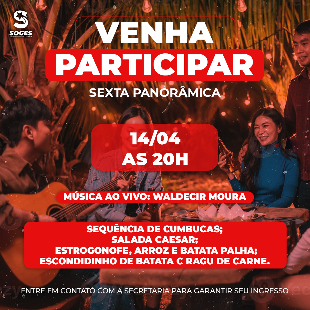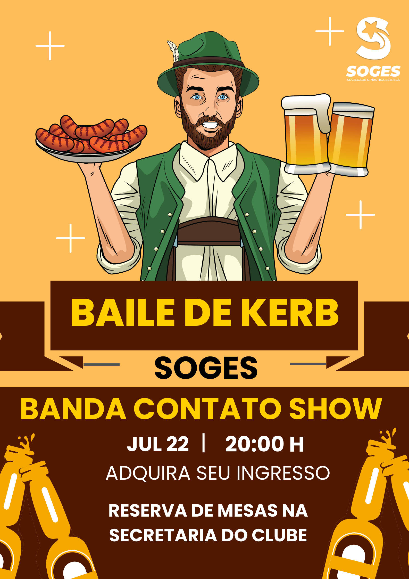 Banda Contato Show Cardápio: Jantar Típico Alemão Horário:20h LOCAL: Salão Social da SOGES Ingressos já a venda na secretaria do clube Valor do Ingresso: SÓCIO INDIVIDUAL R$60,00 com janta NÃO SÓCIO INDIVIDUAL R$70,00 com janta