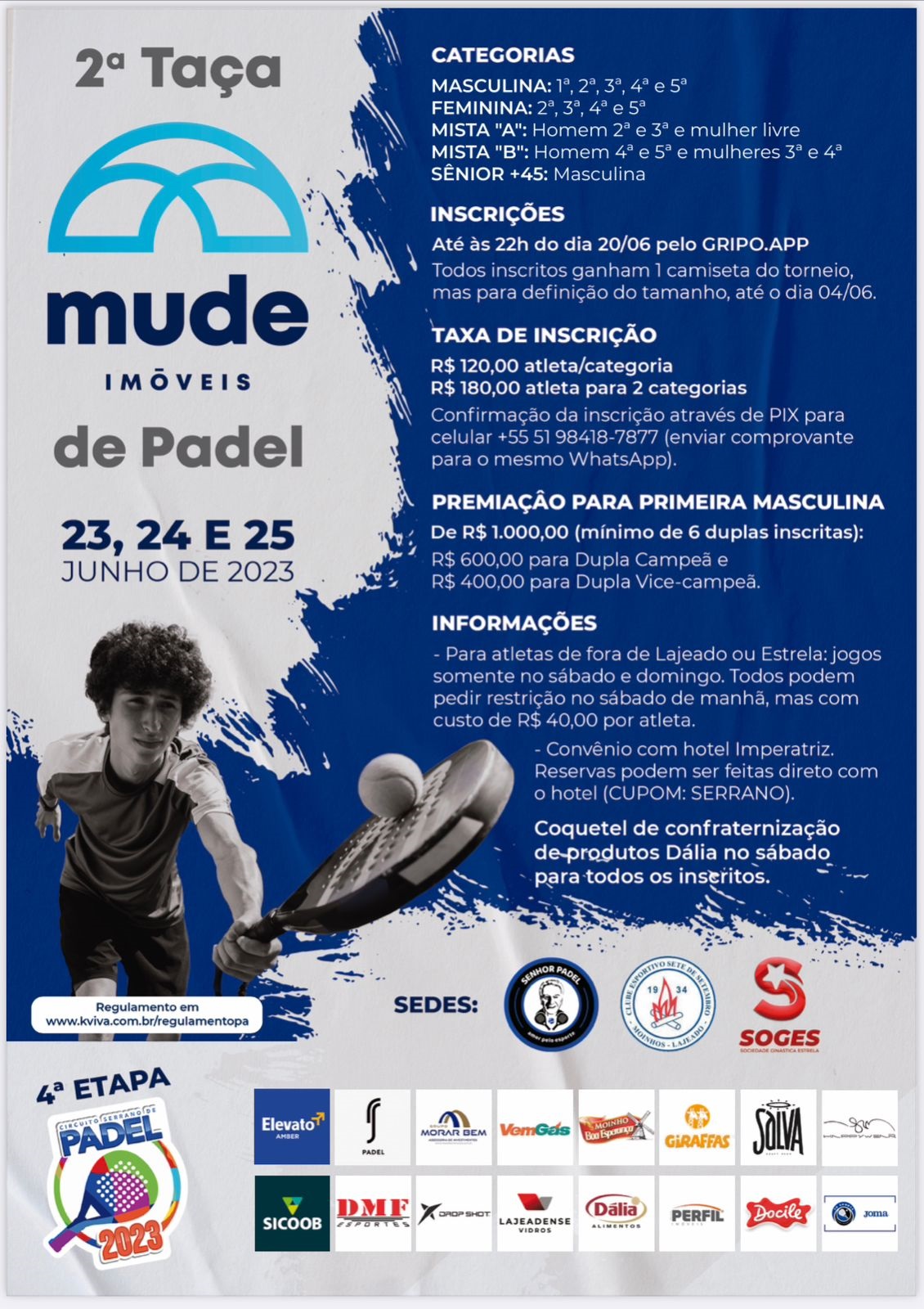 CATEGORIAS MASCULINA 1ª, 2ª, 3ª, 4ª E 5ª FEMININA 1ª, 2ª, 3ª, 4ª E 5ª MISTA “A” HOMEM, 2ª, 3ª E MULHER LIVRE MISTA “B” HOMEM, 4ª, 5ª E MULHERES 3ª E 4ª Sênior +45 MASCULINA PREMIAÇÃO PARA PRIMEIRA MASCULINA De R$1.000,00 (mínimo de 6 duplas inscritas) R$ 600,00 para dupla Campeã R$ […]
